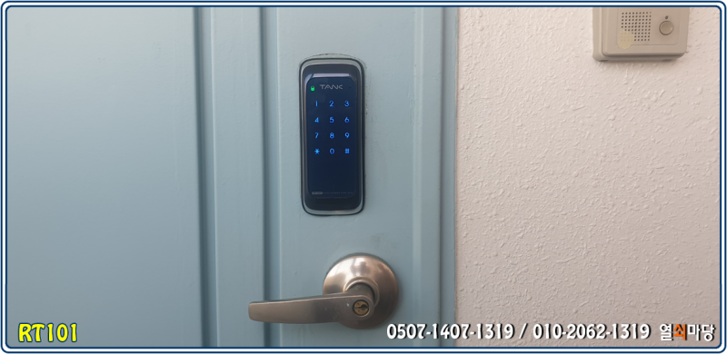 RT101 번호키 색상은 블루로 되어 있으며 터치패드 방식이므로 출입 시 화면을 손바닥 또는 손가락으로 터치하신 후 비밀번호를 입력하시면 됩니다.